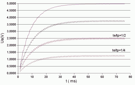 und das Zeitverhältnis te=ta= 0,5*tp dann ist ut1l=ut0*(1-e(-te/T)=5V*(1-0,951)= 0,243V